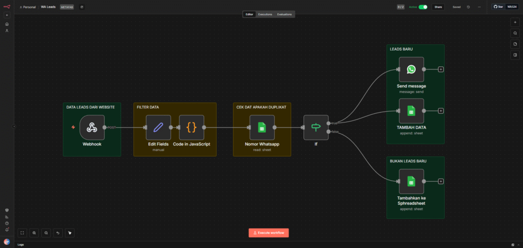 Workflow ini dirancang untuk membantu UMKM dan bisnis jasa merespon calon pelanggan dengan lebih cepat dan terstruktur. Sistem secara otomatis mencatat setiap lead yang masuk dari website form ke Google Sheet, lalu mengirimkan notifikasi real-time ke WhatsApp owner atau admin. Dengan otomatisasi ini, risiko lead terlewat dapat dikurangi secara signifikan, sekaligus meningkatkan kecepatan respon tanpa perlu pemantauan manual.