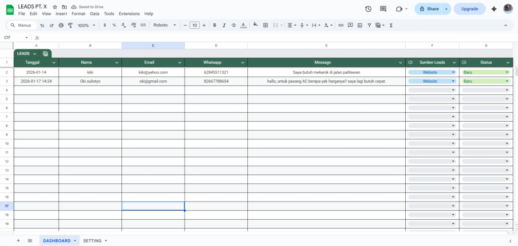 Google Sheet untuk menyimpan leads yang masuk
